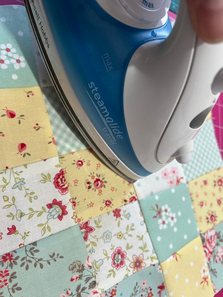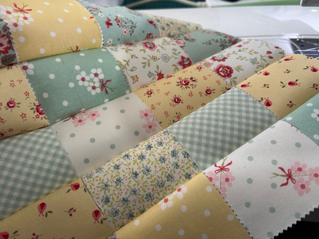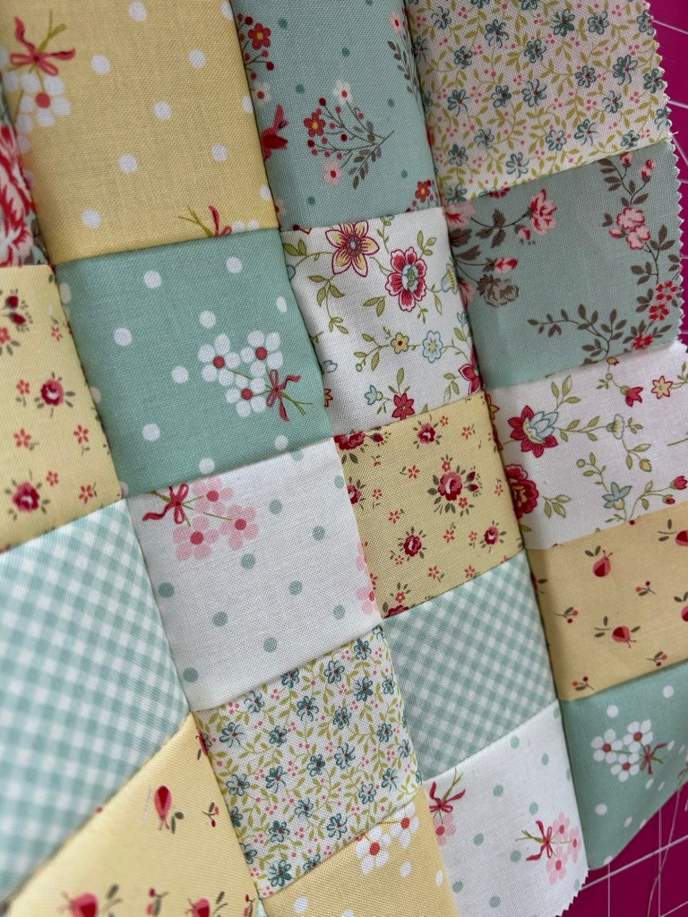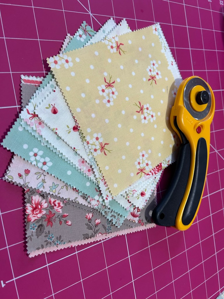 I used the Lyda Rose charm pack for this and picked out a few coordinating patterns and colours then I cut them into quarters – I used 20 2 1/2 inch squares for my panel.