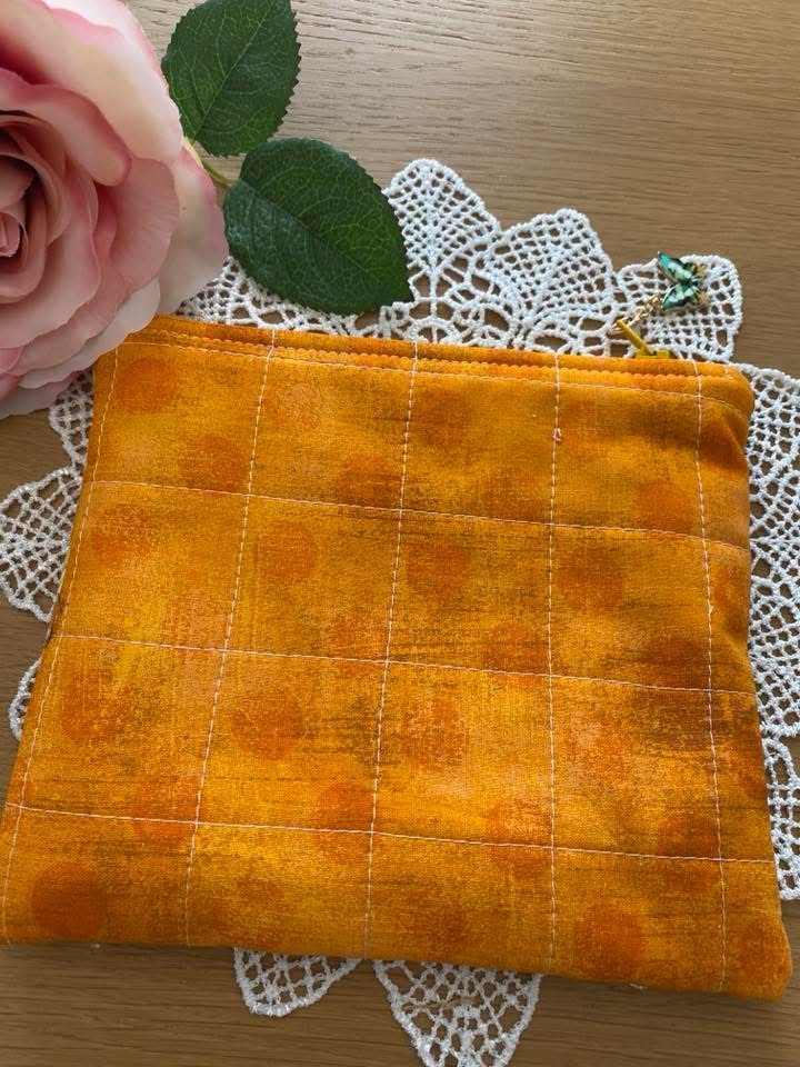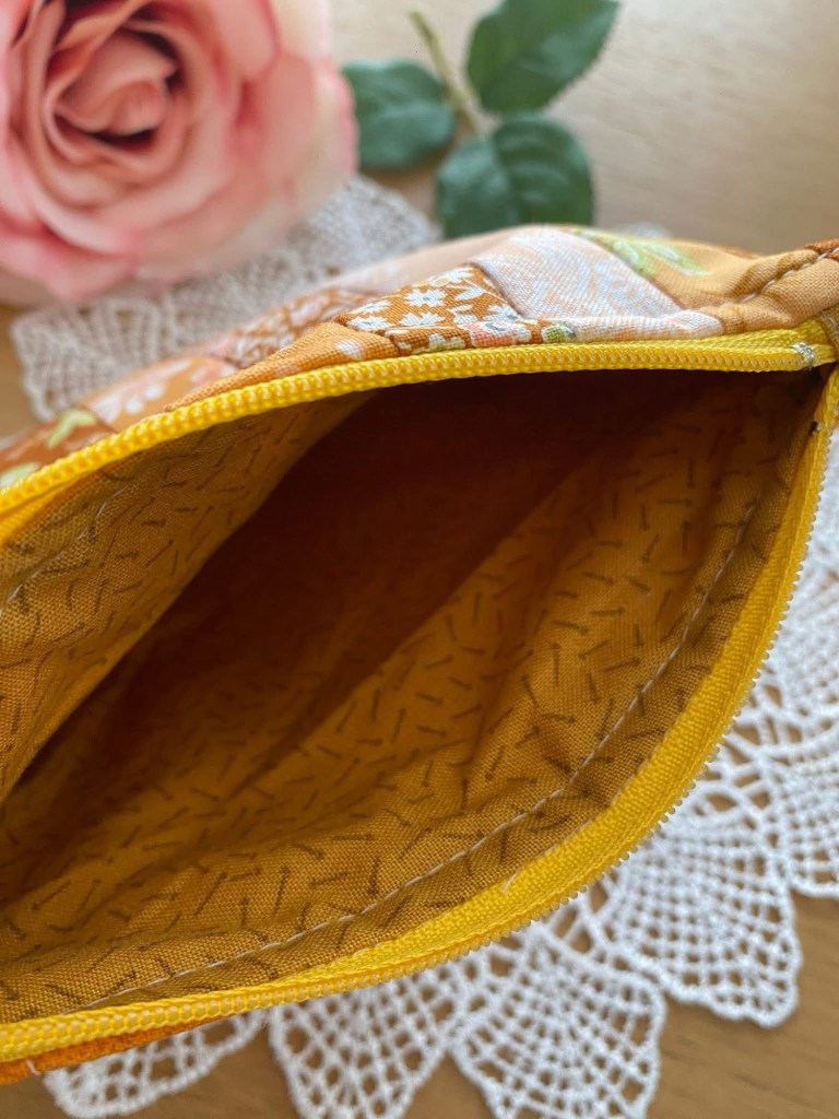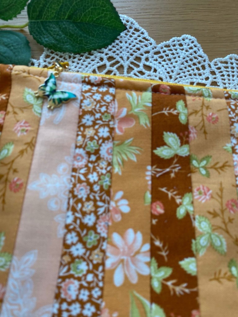 Handmade fully lined quilted patchwork zipper pouch with enamelled butterfly charm on zipper pull. 100% cotton fabric including 2.5” wide strips from Moda Scrapbag cut down to 1.1/4” Measures approx 7” wide and 6” deep.